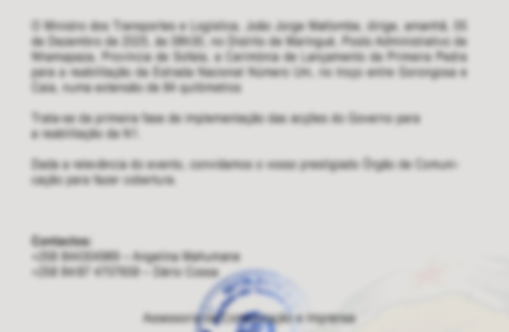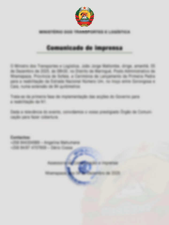 A cerimónia de lançamento da primeira pedra está marcada para esta sexta-feira, 5 de dezembro de 2025, às 08h30. O evento terá lugar no Distrito de Marínguè, no Posto Administrativo de Nhamapaza, na província de Sofala, e contará com a presença do Ministro dos Transportes e Logística, João Jorge Matlombe.